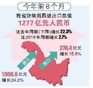 8月份,我省進出口總值179.3億元,增長39.2%。其中,出口39.4億元,增長18.2%;進口139.9億元,增長46.5%。