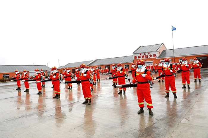 阿木爾林業(yè)局專業(yè)撲火隊員正在進行風力滅火機科目演練(王力 攝)
