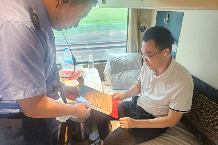 為了讓旅客也參與到安全行動中來,乘務(wù)員們化身安全宣傳員,穿梭在各個車廂為旅客發(fā)放安全知識宣傳單,不斷強化旅客的安全意識。