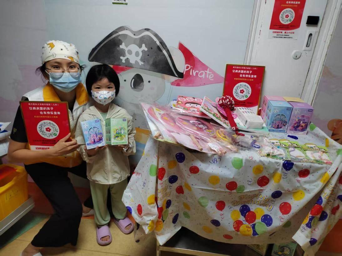 圖片說明:在南方醫(yī)科大學(xué)南方醫(yī)院,志愿者和小朋友們一起開展愛心義賣