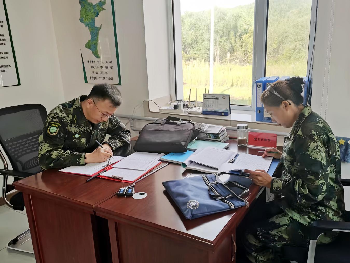 集團(tuán)評(píng)審組檢查管護(hù)站的內(nèi)業(yè)建設(shè)(張凱強(qiáng) 攝)